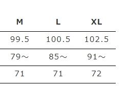 サイズ表は上から総丈長、ウエスト、股下(すべてcm)になります